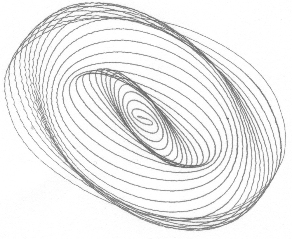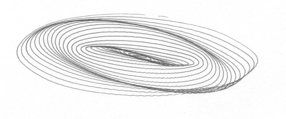 | The harmonograms it produced were mostly rubbish, small scribbles. However it did manage to produce these few reasonable spirals, note that these are probably larger than the originals which were roughly tuppence sized. |